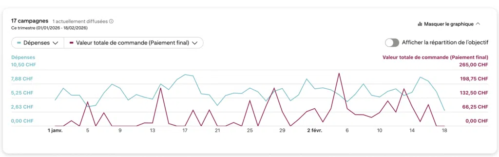Pour optimiser une campagne de conversion sur Pinterest, il est recommandé de dédier un budget quotidien minimum de 20 € / CHF (soit environ 600 par mois).