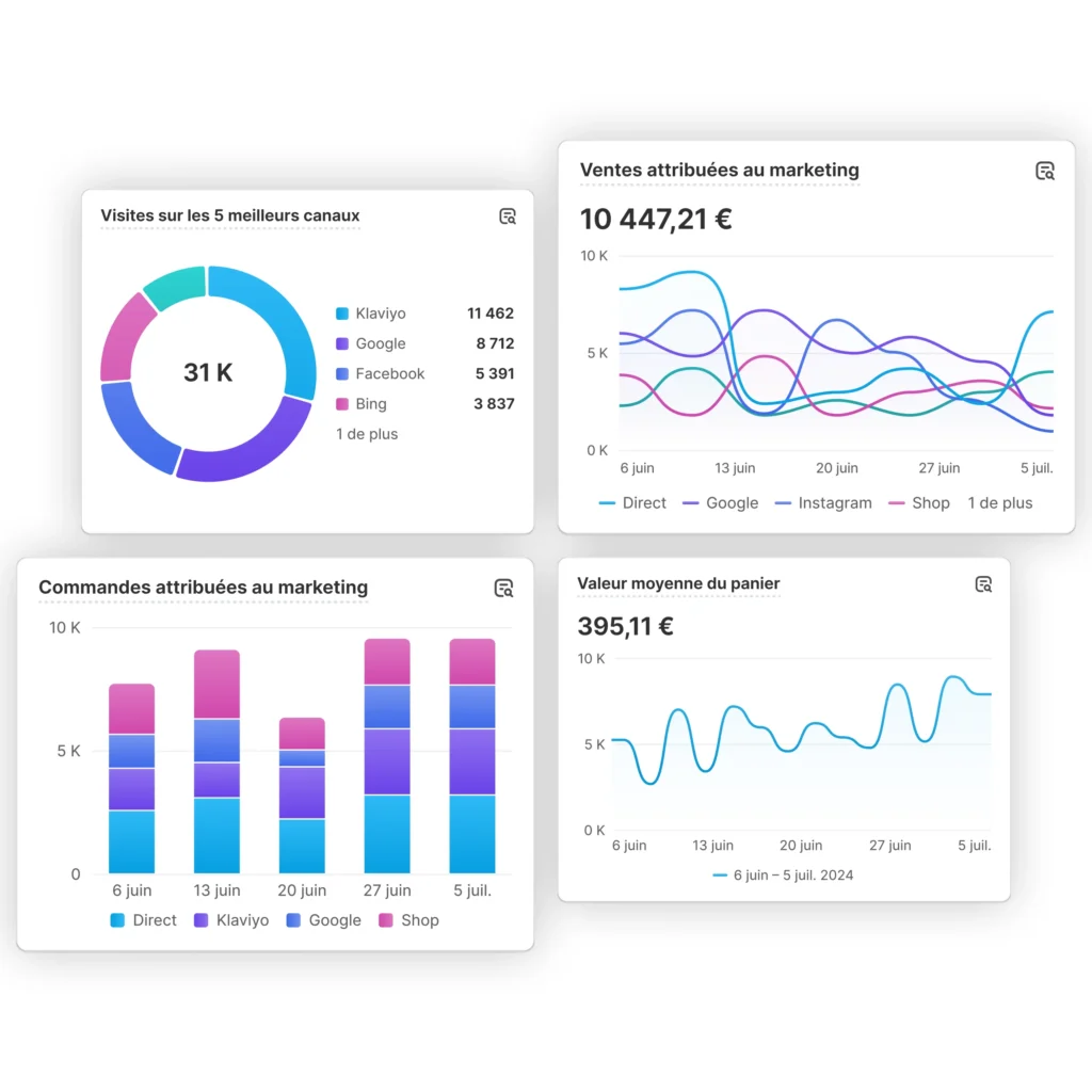 Nous analysons la LTV (Lifetime Value) et mettons en place des stratégies de retargeting et d'emailing pour faire revenir vos clients.